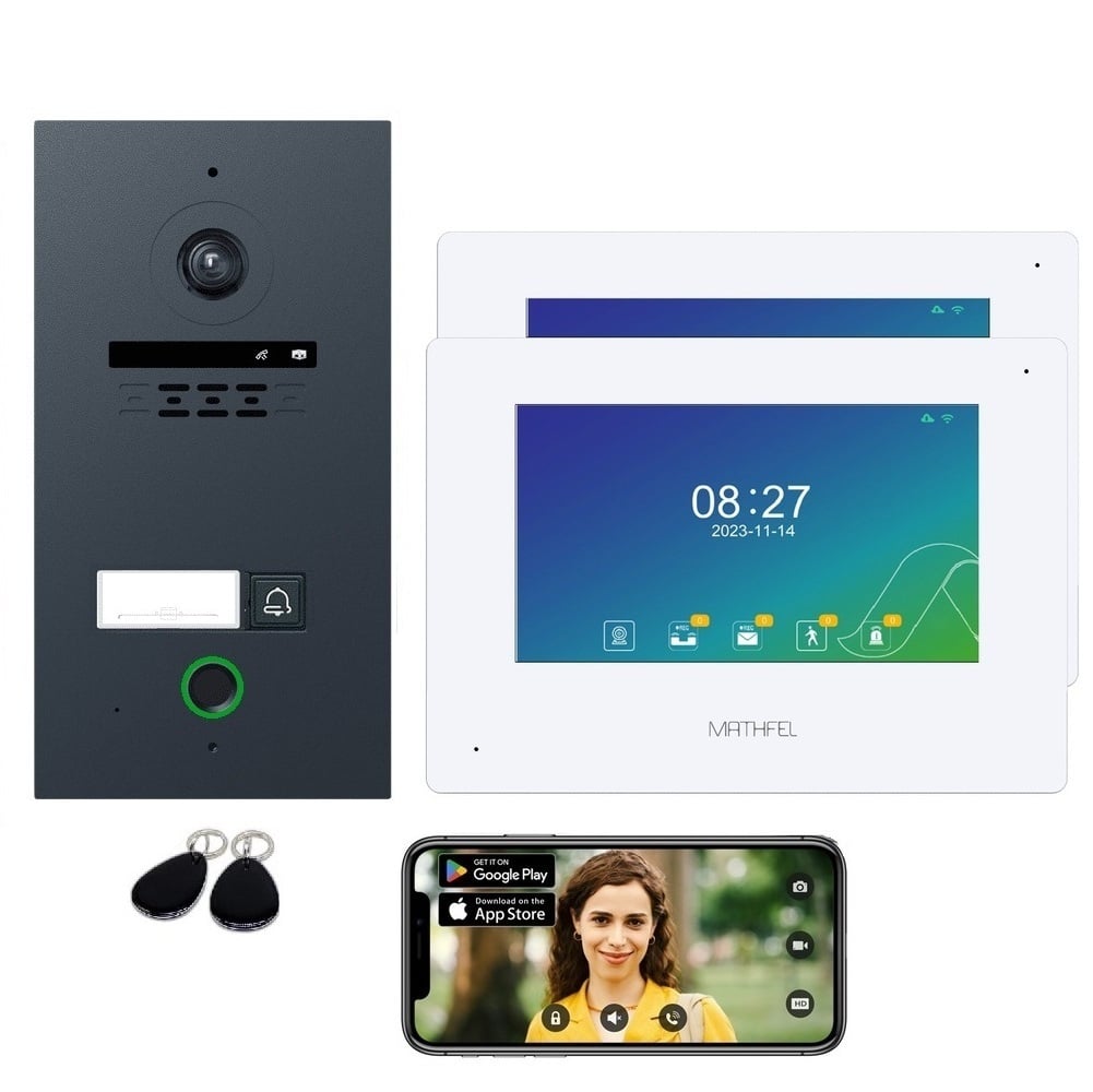 Die Video-Türsprechanlage für ein Einfamilienhaus besteht aus einer Gegensprechanlage (Außenstation) mit Weitwinkel-Kamera in Full HD-Auflösung. Ergänzt wird sie durch Antwortstationen für den Innenraum mit Touch-Bildschirm pro Wohnung. Die Außenstation ermöglicht es, den Besucher an der Tür nach dem Klingeln zu sehen und mit ihm zu sprechen. Die 2-Draht-BUS Technologie sorgt für eine unerreicht leichte und schnelle Installation. Zwei Drähte genügen, um gleichzeitig Video, Audio und Strom zu übertragen. Ersetzt Mathfel 2 Draht BUS Türsprechanlage eine schon bestehende ältere Türsprechanlage, kann im Normalfall sogar deren alte Verdrahtung weiterverwendet werden. Die Monitore sind in Weiß verfügbar.