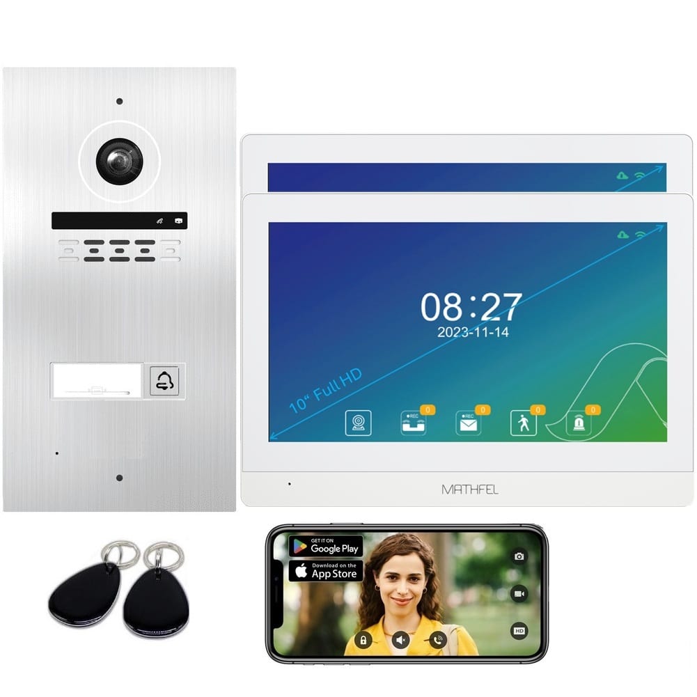 Die Video-Türsprechanlage für ein Einfamilienhaus besteht aus einer Gegensprechanlage (Außenstation) mit Weitwinkel-Kamera in Full HD-Auflösung. Ergänzt wird sie durch Antwortstationen für den Innenraum mit Touch-Bildschirm pro Wohnung. Die Außenstation ermöglicht es, den Besucher an der Tür nach dem Klingeln zu sehen und mit ihm zu sprechen. Die 2-Draht-BUS Technologie sorgt für eine unerreicht leichte und schnelle Installation. Zwei Drähte genügen, um gleichzeitig Video, Audio und Strom zu übertragen. Ersetzt Mathfel 2 Draht BUS Türsprechanlage eine schon bestehende ältere Türsprechanlage, kann im Normalfall sogar deren alte Verdrahtung weiterverwendet werden. Die Monitore sind in Weiß verfügbar.