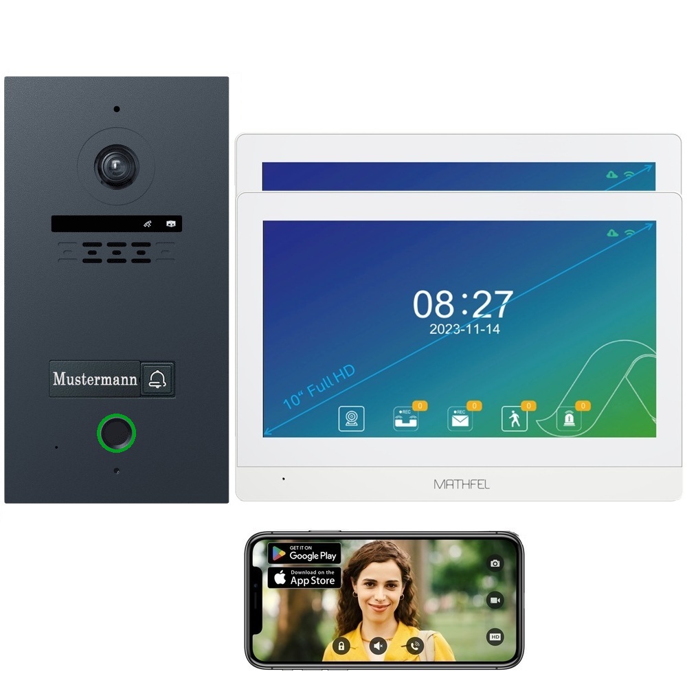 Die Video-Türsprechanlage für ein Einfamilienhaus besteht aus einer Gegensprechanlage (Außenstation) mit Weitwinkel-Kamera in Full HD-Auflösung. Ergänzt wird sie durch Antwortstationen für den Innenraum mit Touch-Bildschirm pro Wohnung. Die Außenstation ermöglicht es, den Besucher an der Tür nach dem Klingeln zu sehen und mit ihm zu sprechen. Die 2-Draht-BUS Technologie sorgt für eine unerreicht leichte und schnelle Installation. Zwei Drähte genügen, um gleichzeitig Video, Audio und Strom zu übertragen. Ersetzt Mathfel 2 Draht BUS Türsprechanlage eine schon bestehende ältere Türsprechanlage, kann im Normalfall sogar deren alte Verdrahtung weiterverwendet werden. Die Monitore sind in Weiß verfügbar.