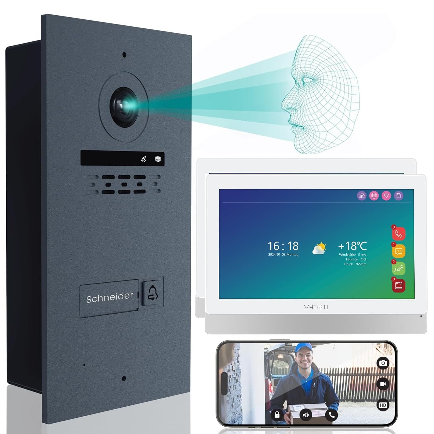 Mathfel 2-Draht BUS WLAN Video-Türsprechanlage | Gesichtserkennung | 7 Zoll oder 9 Zoll Monitor | 2 Megapixel HD Kamera | 170° Weitwinkel Außenstation Anthrazit | 1-Familienhaus