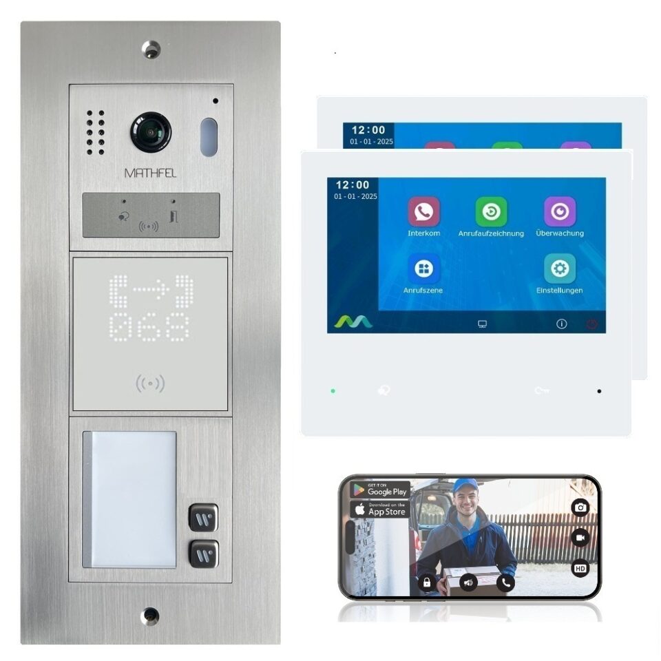 Diese Video-Türsprechanlage besteht aus einer Gegensprechanlage (Außenstation) mit Kamera und 7″ Monitoren für den Innenraum mit Touch-Bildschirm und WLAN-Schnittstelle (optional). Die Außenstation ermöglicht es, einerseits den Besucher an der Tür nach dem Klingeln zu sehen und mit ihm zu sprechen. Über die 2-Draht-Verbindung werden sämtliche Funktionen von der Türstation an die Innenstation angeschlossen: Klingel, Video und Bild, Gegensprechanlage, Steuerung des Türöffners und die interne Kommunikation (Interkom) zwischen den Innenmonitoren. Die Produkt-Technik ermöglicht es, die Türsprechanlage mit mehreren Wohneinheiten gemeinsam zu nutzen. Jede Einheit kann bis zu vier Monitore anschließen. Das System kann maximal vier Außenstationen erfassen.Außenstation: