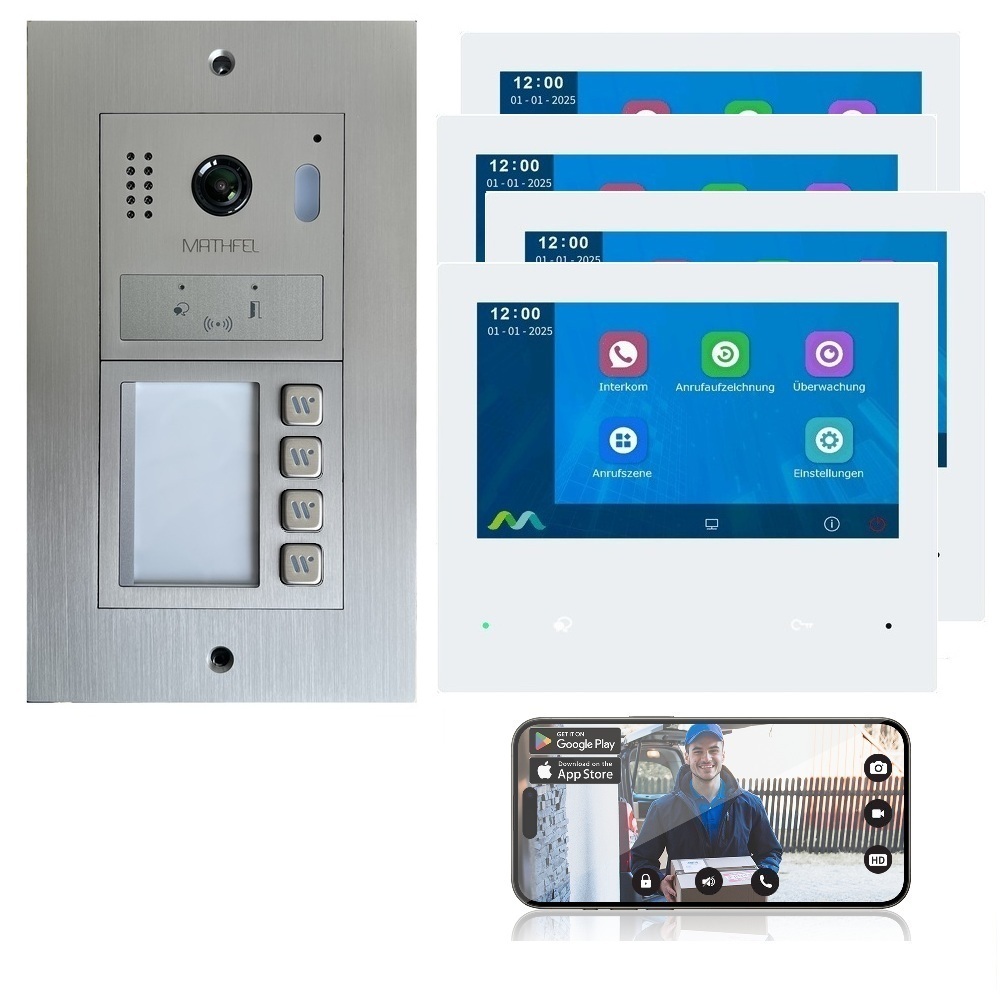 Diese Video-Türsprechanlage besteht aus einer Gegensprechanlage (Außenstation) mit Kamera und 7″ Monitoren für den Innenraum mit Touch-Bildschirm und WLAN-Schnittstelle (optional). Die Außenstation ermöglicht es, einerseits den Besucher an der Tür nach dem Klingeln zu sehen und mit ihm zu sprechen. Über die 2-Draht-Verbindung werden sämtliche Funktionen von der Türstation an die Innenstation angeschlossen: Klingel, Video und Bild, Gegensprechanlage, Steuerung des Türöffners und die interne Kommunikation (Interkom) zwischen den Innenmonitoren. Die Produkt-Technik ermöglicht es, die Türsprechanlage mit mehreren Wohneinheiten gemeinsam zu nutzen. Jede Einheit kann bis zu vier Monitore anschließen. Das System kann maximal vier Außenstationen erfassen.